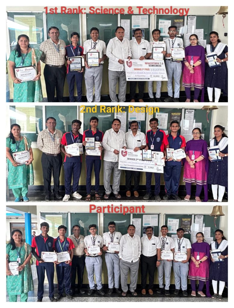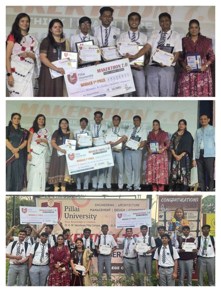 On 10th December 2025, the Pillai University, New Panvel  had organized intercollegiate competition ” MAKERTHON 7.O “. There were total 50 colleges with 200 Groups participates in this mega event. Changu Kana Thakur Secondary and Higher Secondary Vidyalaya, New Panvel participated in Makerthon competition under the guidance of  Respected Principal Mr. Prashant More Sir, Supervisor Mr. Ajit Sonawane Sir(Arts and Commerce), and Supervisor Mrs. Swati Patil Madam (Science). The students from XI and XII standards participated in 4 different groups (Science and Technology, Designing and Bizathon). There were 4 students in each group.  Students from class XI and XII Science Mast. Mirza Abdullah Sharique (XI S9), Mast. Patil Nishant Sandip (XI S9),  Mast. Mhatre Dhruval Deepak (XII S8), Mast. Yadav Sudhakar Shivgopal( XII S8)  secured First prize and  awarded with trophy and group cash prize  of 10000₹. and (mentor)guided teacher Mrs. Samita Rajendra Wangane madam awarded with trophy and cash prize of  3000₹. under the Group category Science and Technology. Mast. Sonkamble Ujjwal Dalit (XI S1), Mast. Shaikh Nasibali Shajad (XI S1), Mast. Bhosale Pranav Sanjay( XI S1), Mast. Kamble Yash Naresh (XI S1) in the other groups under the category  Creativity, secured second prize and awarded with trophy and group cash prize of 7500₹. and (mentor)guided teacher Mrs. Arti  Khuspe madam awarded with trophy and a cash prize of 2500₹.